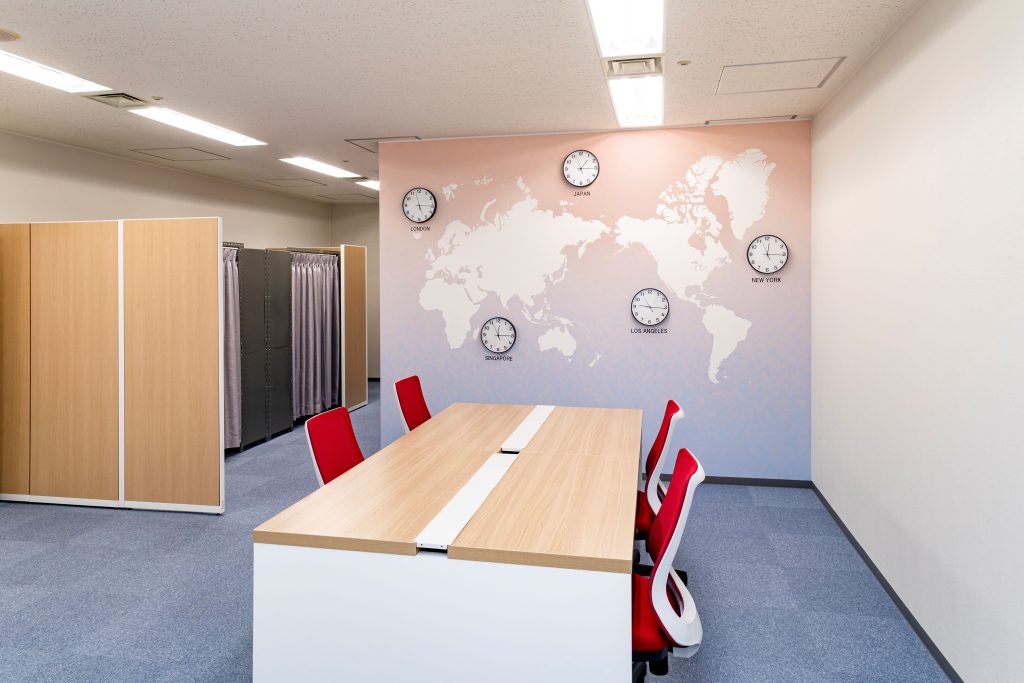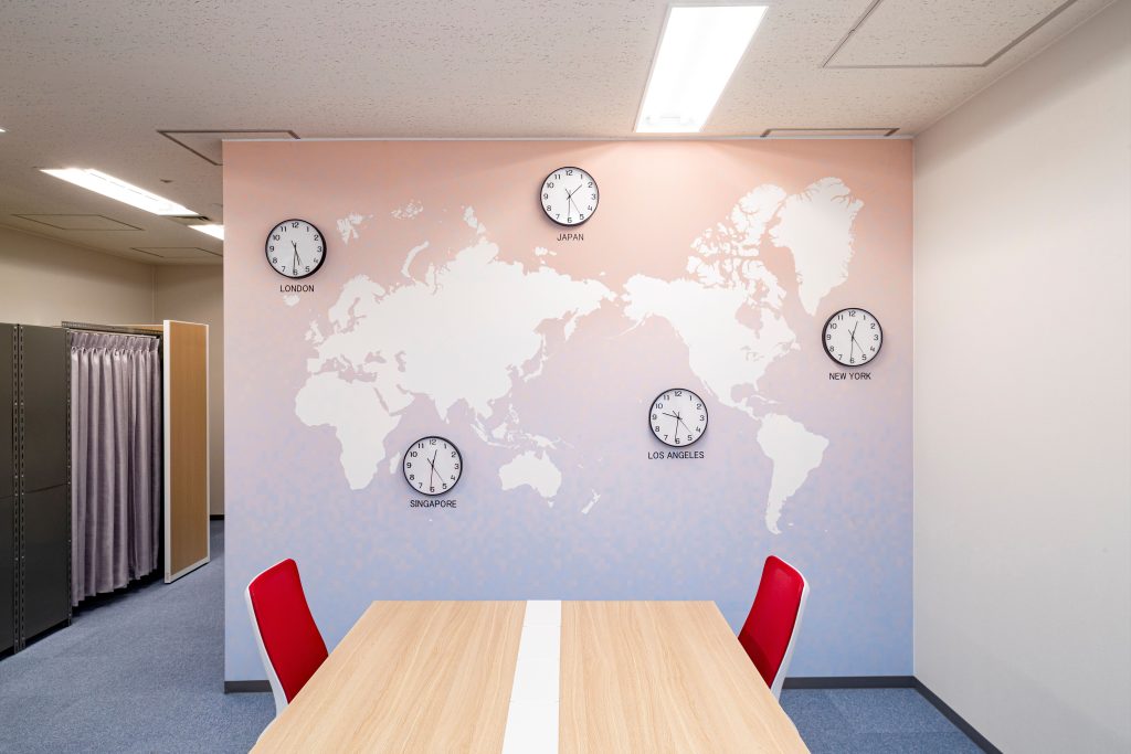 - 世界地図を壁紙に表現し主要国の時計を配置することで、グローバルな視点を持って働けるオフィスデザインとした
