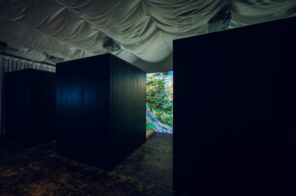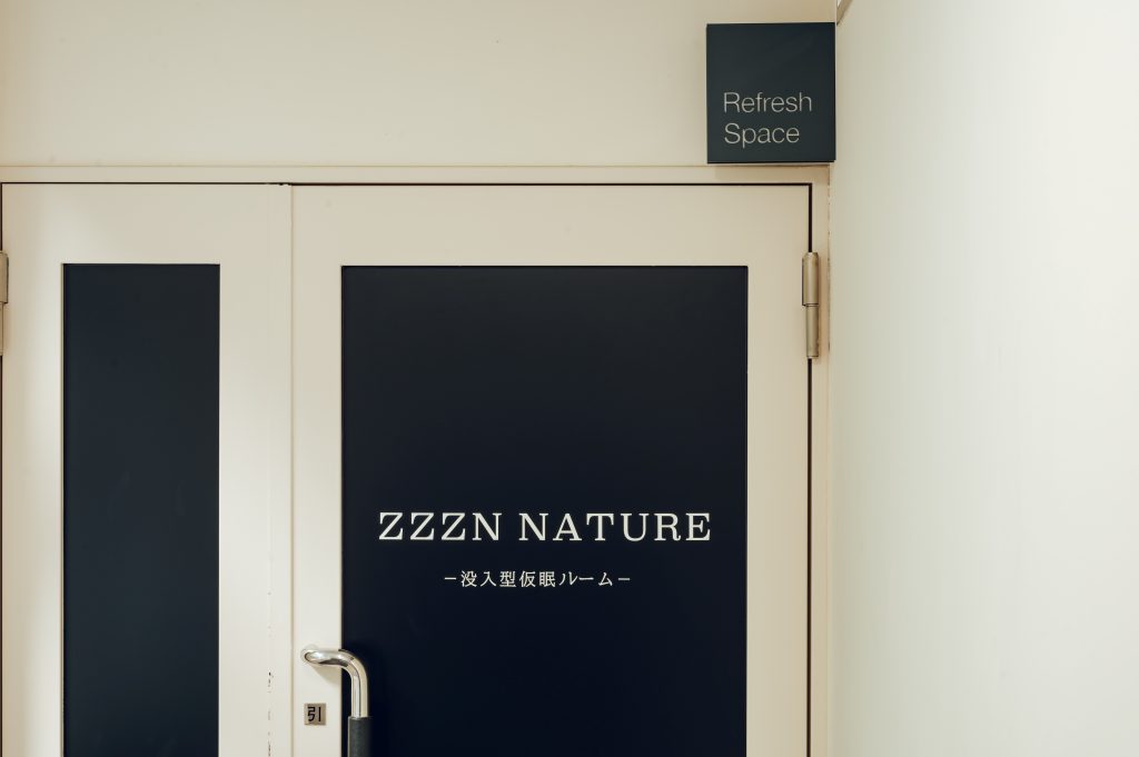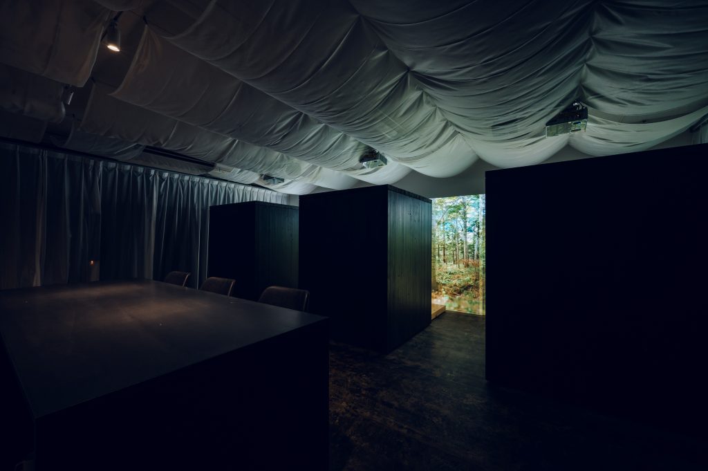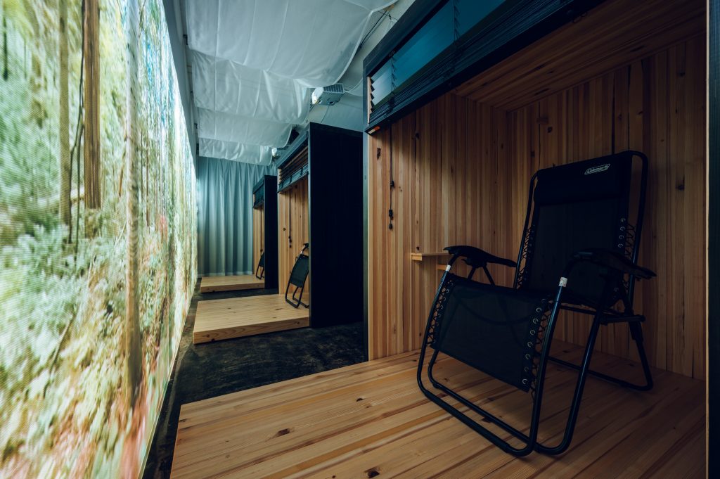 部屋に入ると突然暗くなり、音楽と香りが相まって、まるで別世界に入り込んだような感覚になります。その中で映し出される森林映像は、単なる2次元的なものではなく、奥行きを感じられるものとして体験されます。そして、ブースに入ると森林に包まれ、現実社会から切り離されることでリラックスしながら仮眠をとることができます。