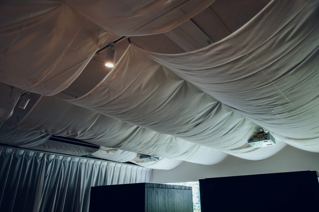 予算の制約や既存設備を残したままの改修だったため苦労もありましたが、天幕や暗闇をつくることで既存の仕上げや設備が目立たないよう工夫しました。