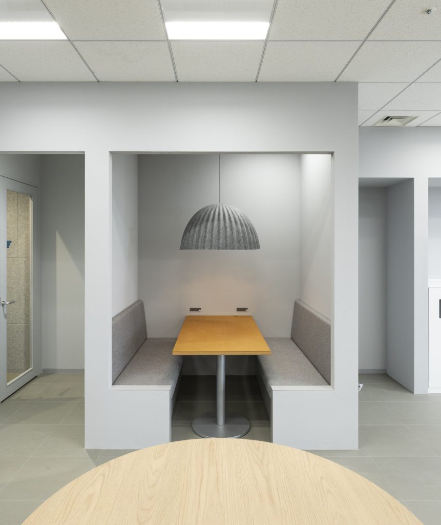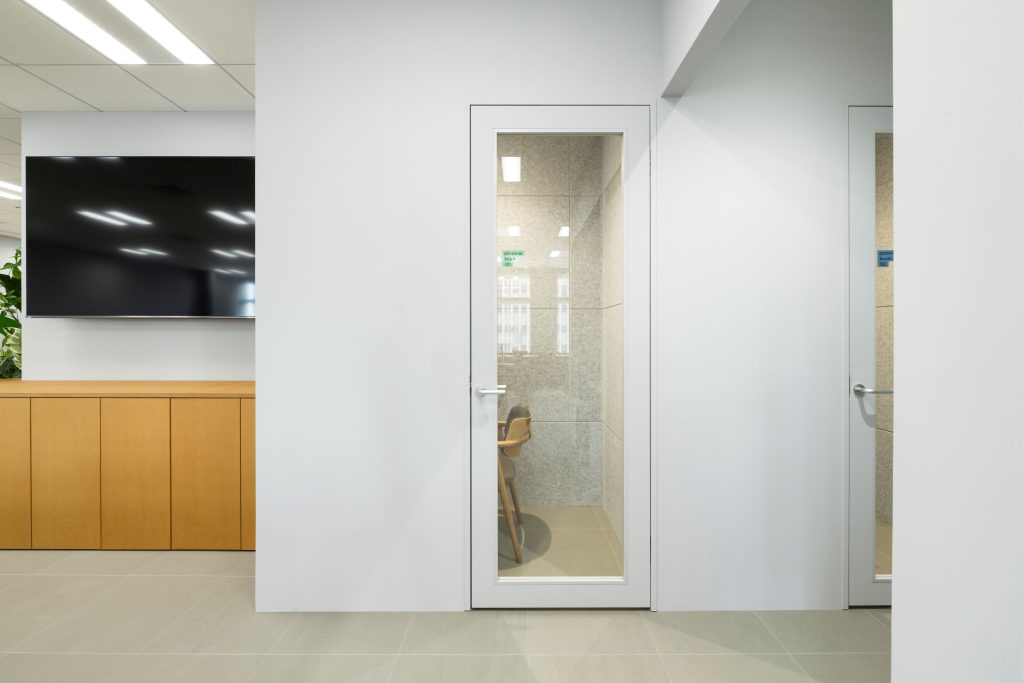 - 空調機能を備えた空間に溶け込む造作ブースを設置することで、WEBミーティング等が快適に行える空間とした