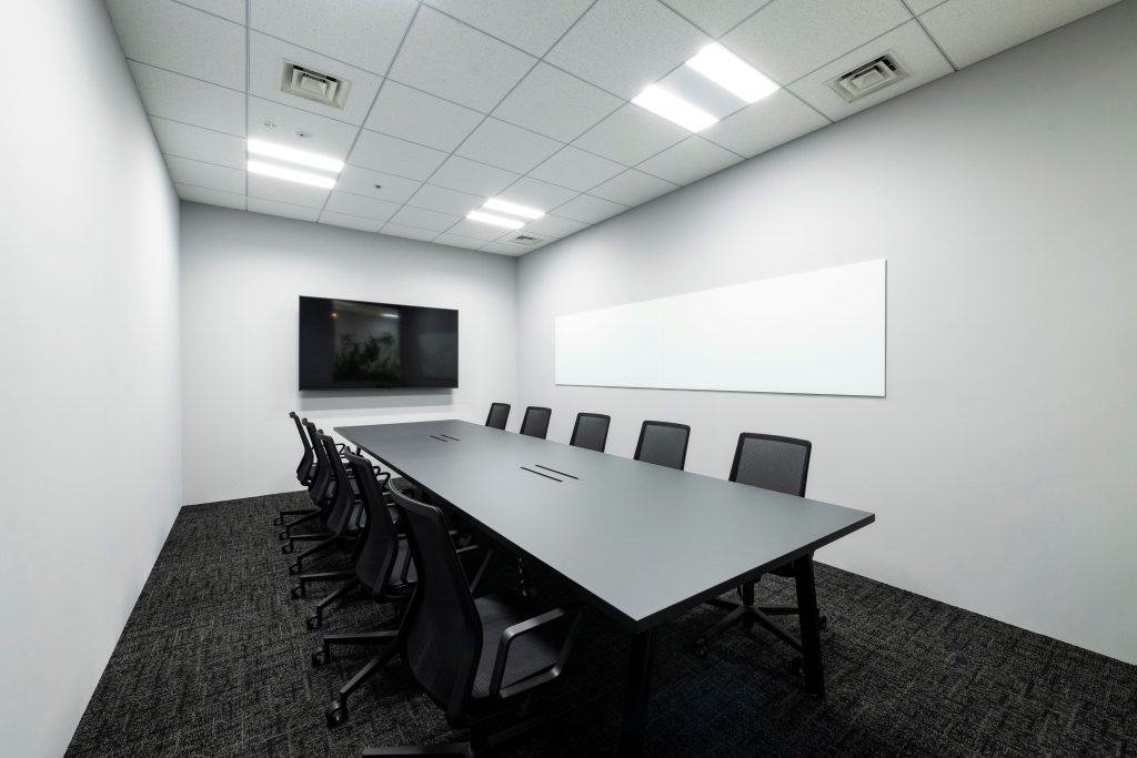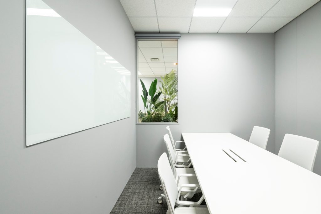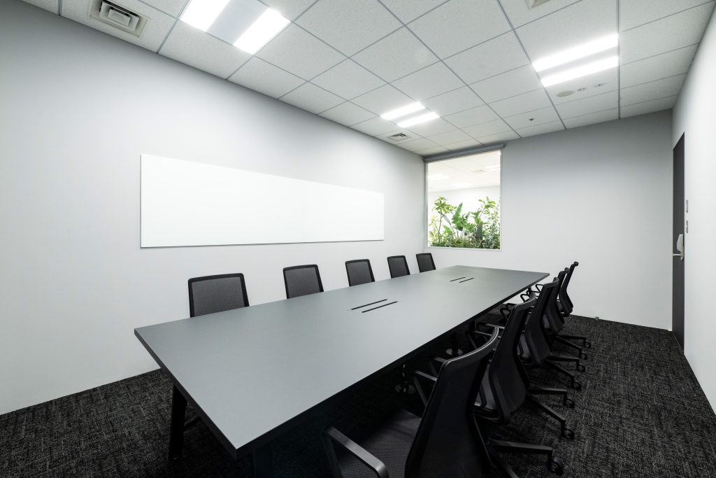 - 会議室には大型モニターとガラスホワイトボードを設置し、資料共有や意見交換を円滑に行える環境を整えるとともに、ガラス窓越しに執務エリアのグリーンを眺めながらリラックスして会議ができる空間とした