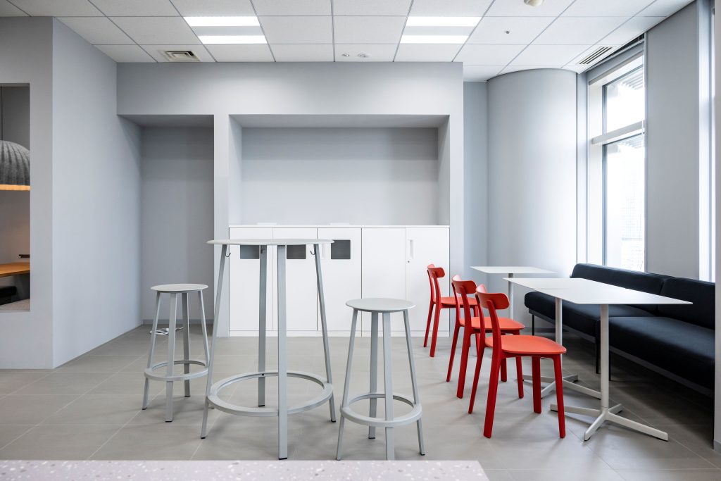 - 窓際には、カウンター席に加え、コミュニケーションや休憩に利用できるソファ席を設け、気分転換や交流が生まれる空間とした